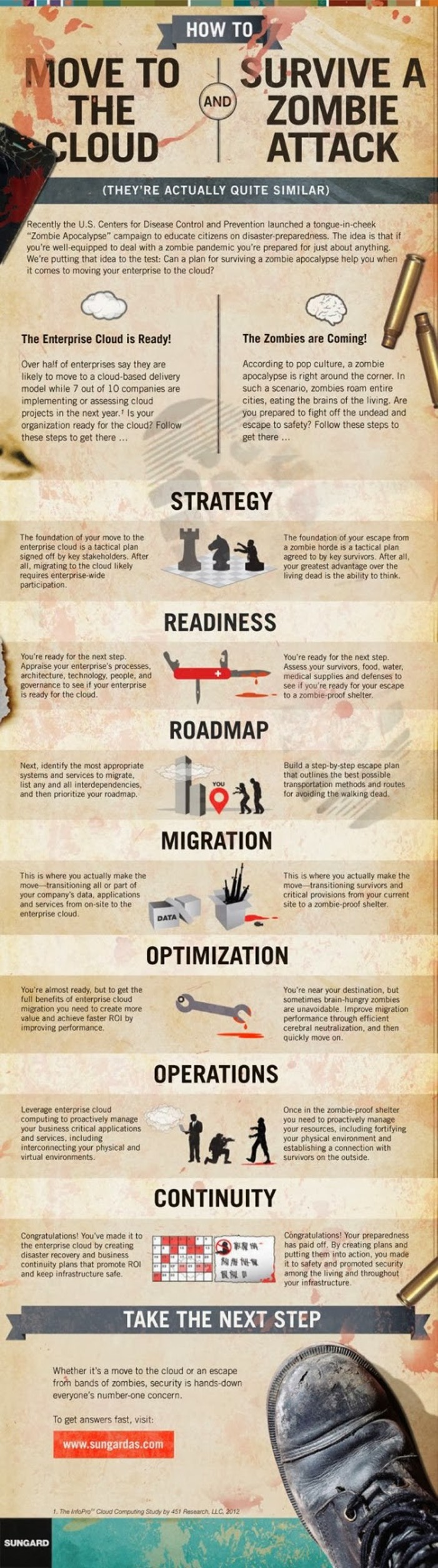 As the infographic below will illustrate, both cloud migration and surviving a zombie attack take careful preparation and polished execution.